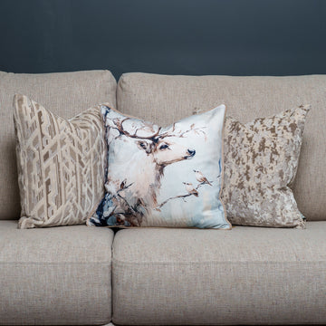 Embrace the quiet beauty of winter with the Rustic Stag In The Snow Velvet Cushion. This exquisite design captures a majestic winter stag standing gracefully amidst snow-covered branches, accompanied by gentle, playful birds softly perched and seemingly chatting with their noble companion. The delicate brushstroke effect and muted palette of icy blues, soft creams, and warm browns create an atmospheric scene filled with calm and rustic charm.